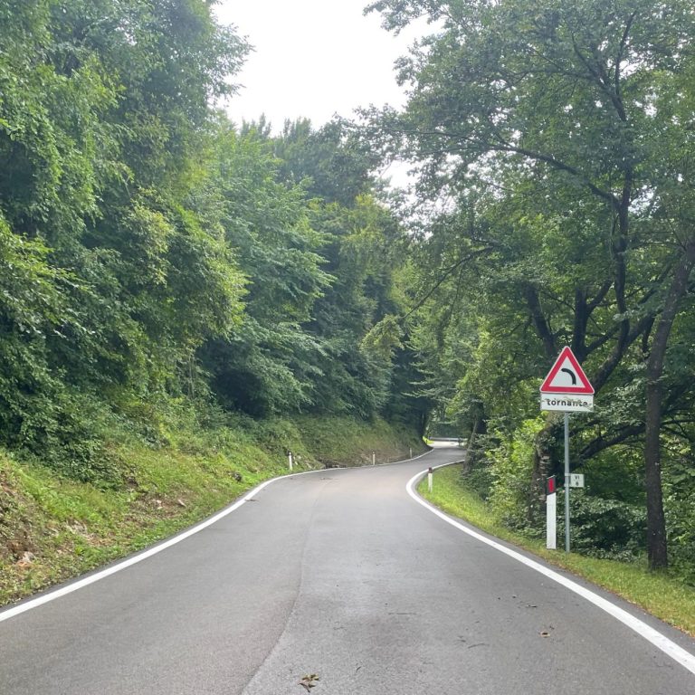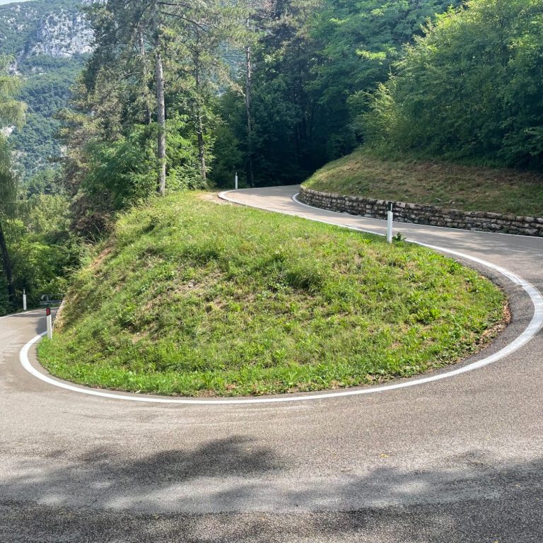 Leaving Arco, the road wastes no time tilting upward as it threads through olive groves and lower forest. The gradient is firm from the start—consistently steep rather than brutally spiky—forcing you into a steady, focused rhythm. Traffic drops away almost immediately, and the climb feels calm and purposeful.