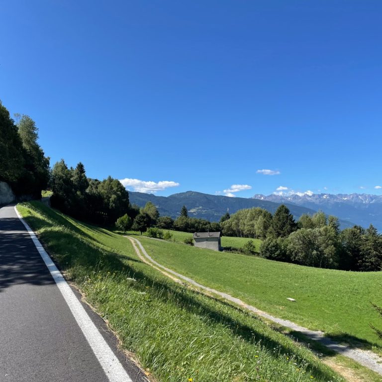 Wooded sections are followed by lovely open meadows with great views over the valley below and into the distance. As the road weaves its way up the hill, your legs start to tire and burn.