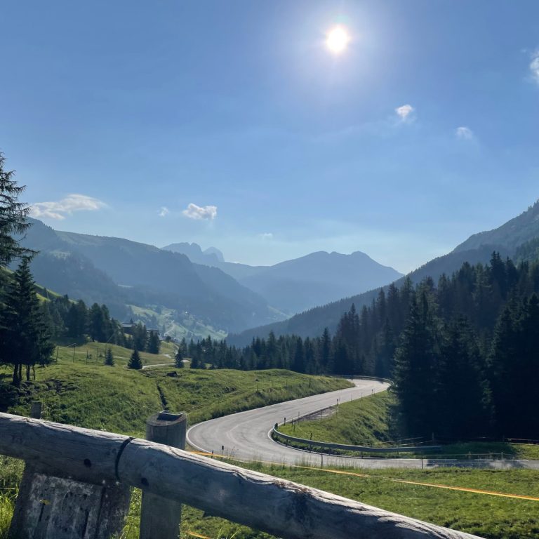 The road is empty first thing in the morning and it winds its way beautifully up the hill. Totally peaceful, aided by a wide open alpine meadow through which the road winds itself to the top.
