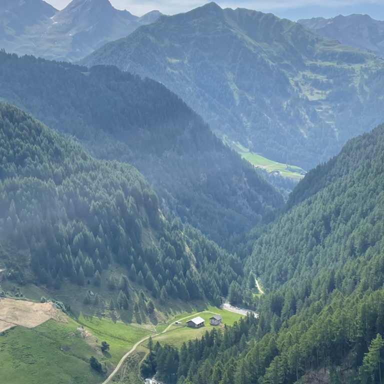 The valley is far below you and feels lost in time. The Italian side is much less developed than the Austrian side and exudes a aura of peace and calm. Meadows, mountain huts, cows.